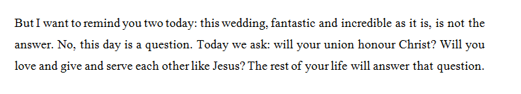 Weddings do hold a great fascination for human kind. They consist of great joys, traditions, promises, losses and gains, endings and beginnings. They transport us through time, looking back, looking forward, remembering those who have gone before and those yet to come. They tie us to our families and they unite what once was separate. They provide hope as we express faith and love. They amplify our faith to the witnesses who gather, as we are reminded of the Great Designer’s plan for human kind to be joined as one, to live in love and commitment to one another. At my daughter’s wedding yesterday, I was reminded by the best man (in his humorous yet poignant speech) that a wedding day poses a great question to Christian couples: will this relationship honour Christ? The day is the question. The marriage is the answer.